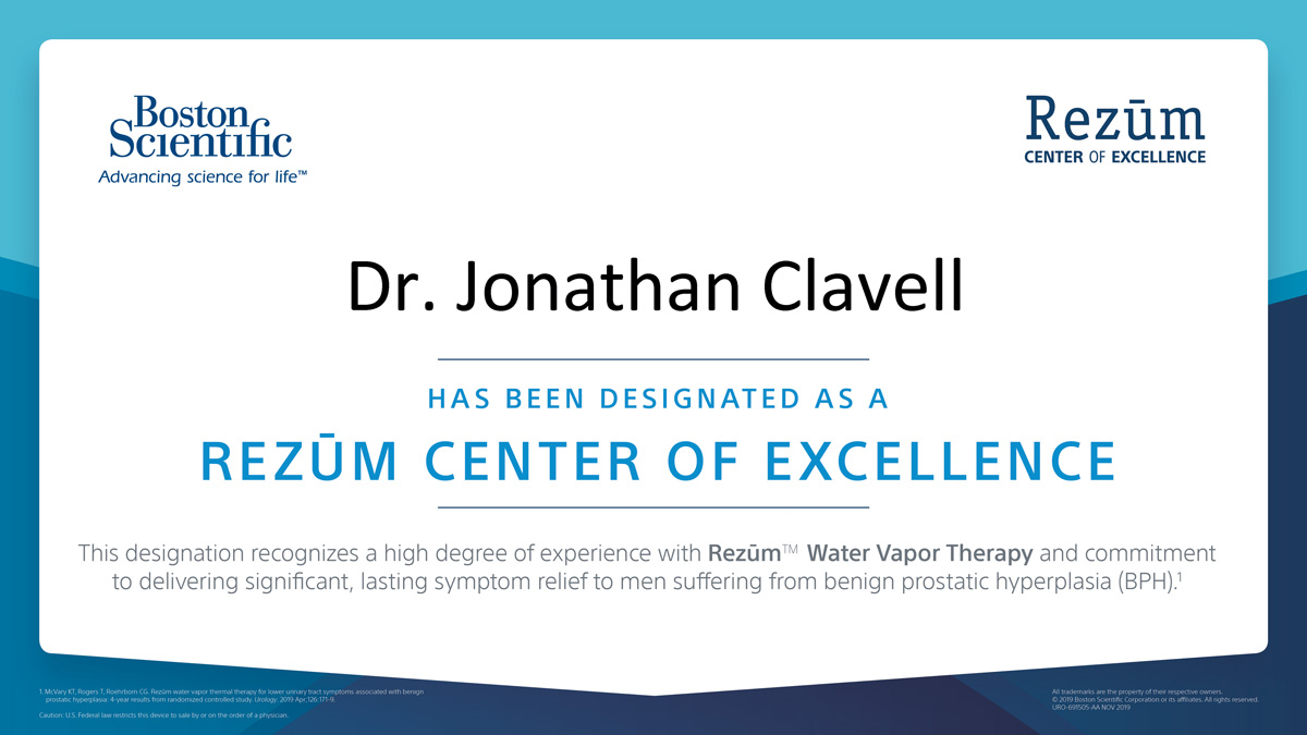 El Dr. Clavell es experto en BPH y en el tratamiento de Rezum. Su protocolo es muy conocido para minimizar molestia, optimizar resultados en pacientes y actualmente está siendo adoptado por muchos urólogos en la comunidad. Dr. Clavell se sentará con usted y le explicará en detalle que debe de esperar antes, durante y después de su procedimiento. Llamé a nuestra oficina hoy y saque su cita.
